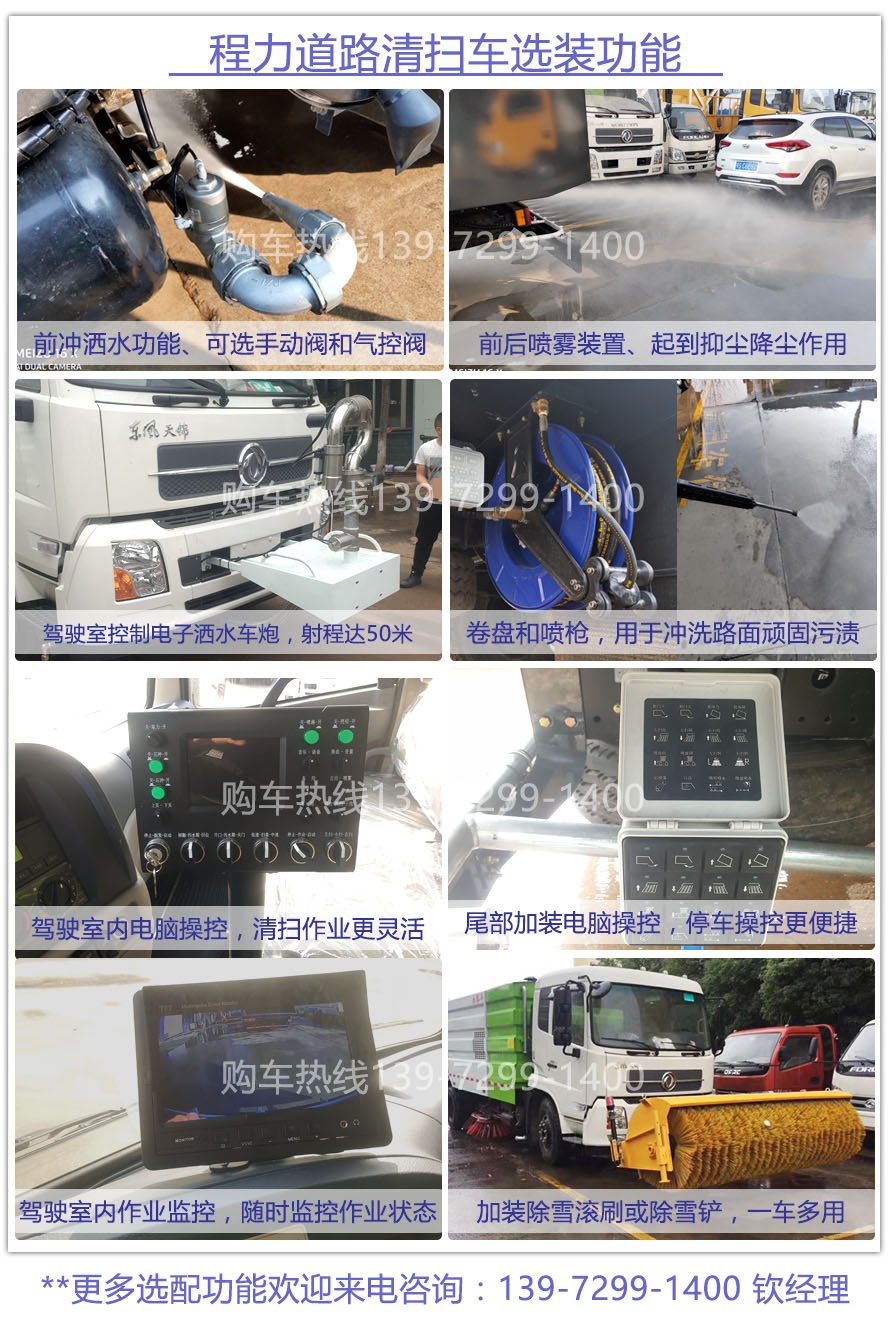 三、選裝配置: 選裝倒車和左右掃影像;選配前沖后灑、杭州威龍灑水泵,前置綠化炮、前后噴霧;選裝自潔帶卷盤;副水箱加大;手持吸塵管;低水位報警系統(tǒng)。3308以上車型可加裝除雪滾和雪鏟。